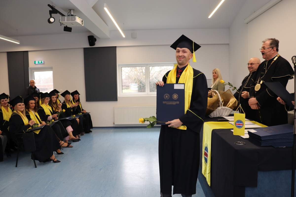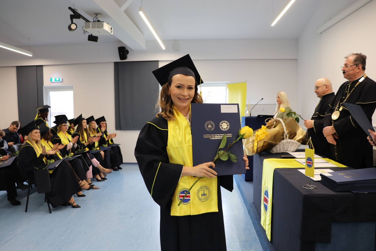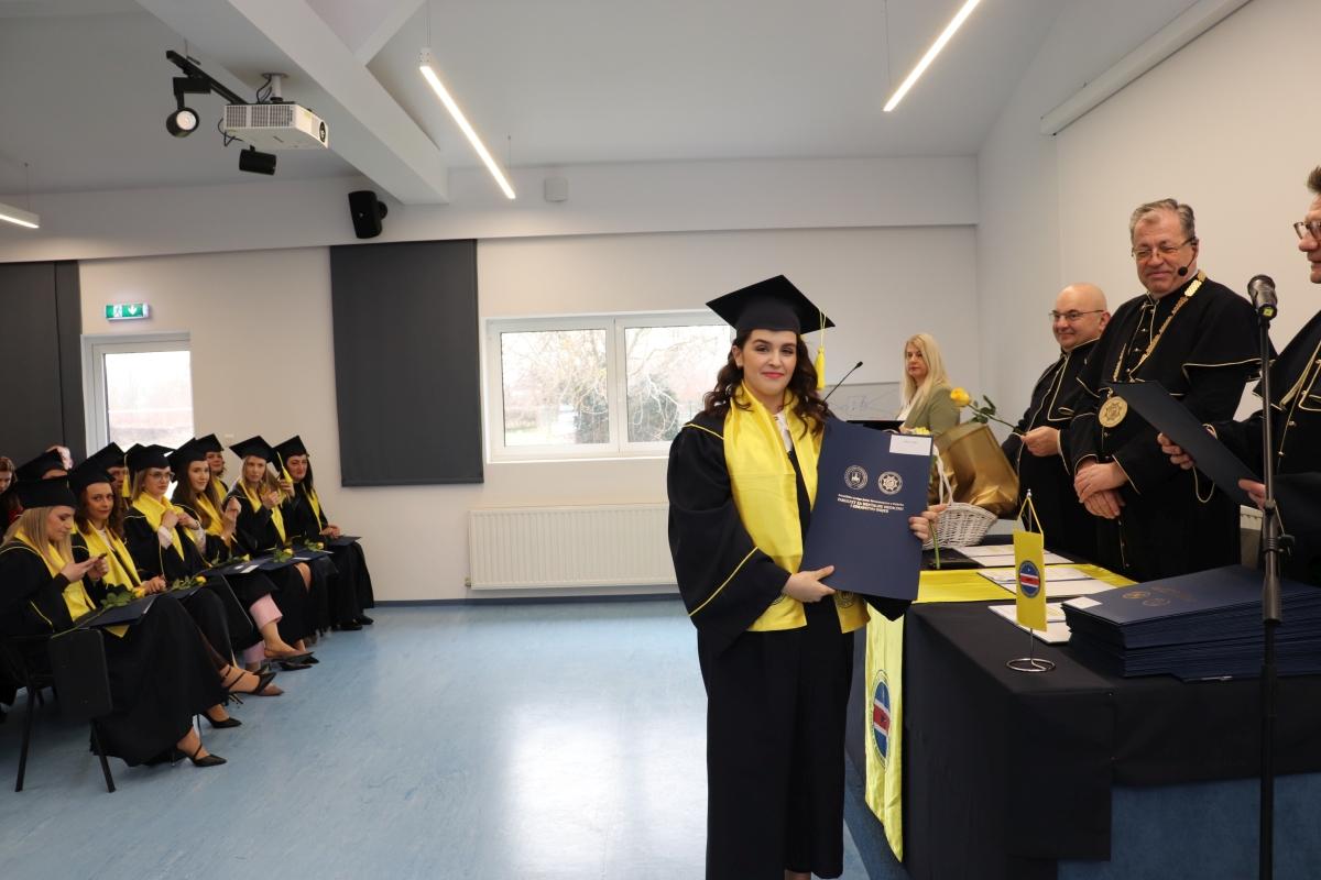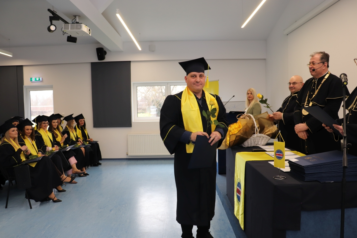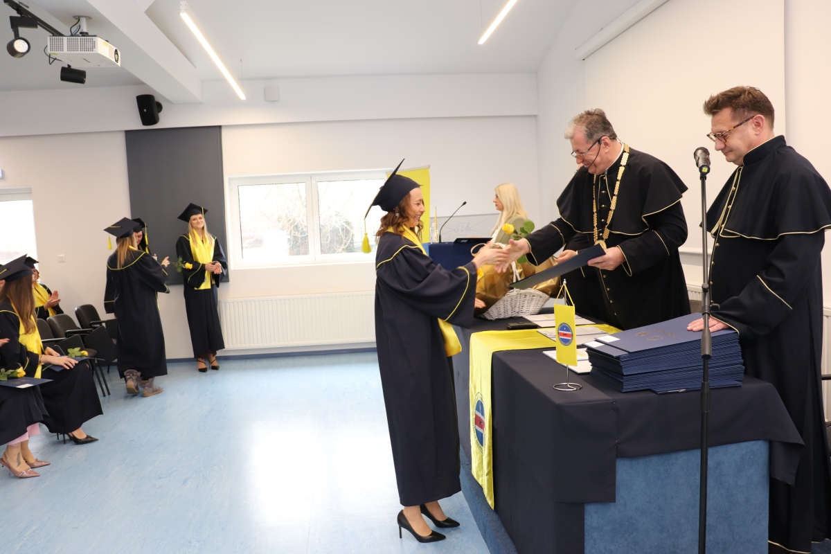 Prof. dr. sc. Ivan Miloloža, prodekan za međuinstitucijsku suradnju i razvoj, zajedno s izv. prof. dr. sc. Vladimirom Grošićem, predsjednikom Katedre za psihijatriju i neurologiju i izv. prof. dr. sc. Rajkom Furešom, izvanrednim profesorom, ovom su prilikom promovirali 66 sveučilišnih magistra sestrinstva Fakulteta za dentalnu medicinu i zdravstvo Osijek.